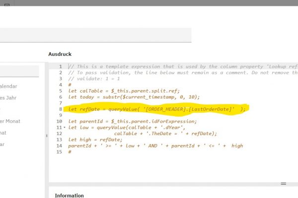 Cognos Kalender – relative Zeiten mit Referenzdatum aus Datenquelle (Datenmodul / queryValue / last Order Date)