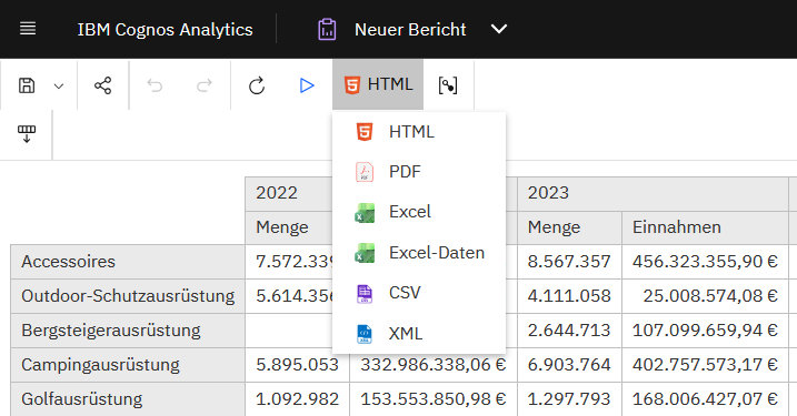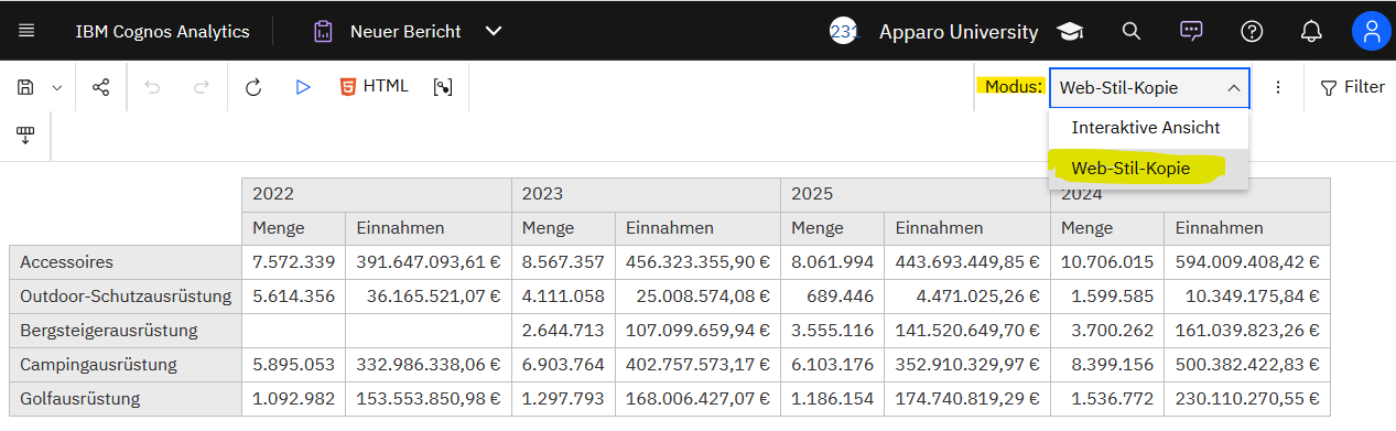Eine besonders praxisnahe Verbesserung ist der neue Web-Style Copy mode für HTML-ausgeführte Reports. Dieser Modus kann über einen neuen View mode selector in der Reporting-Toolbar aktiviert werden. Anders als der bisherige Interactive View erlaubt der neue Modus das Kopieren von Inhalten aus beliebigen Datencontainern. Laut IBM lassen sich dabei nicht nur Werte, sondern auch Hyperlinks und Bilder übernehmen. Das Kopieren erfolgt per Ctrl+C oder über ein eingeblendetes Copy-Icon. Zusätzlich kann der View mode selector per Feature Customization für Rollen und Gruppen ein- oder ausgeblendet werden.