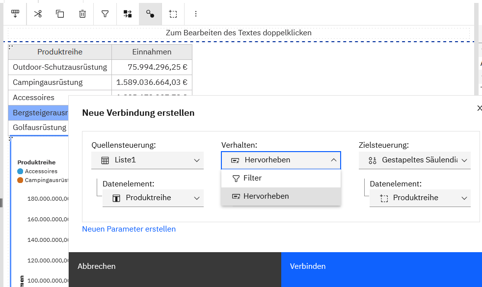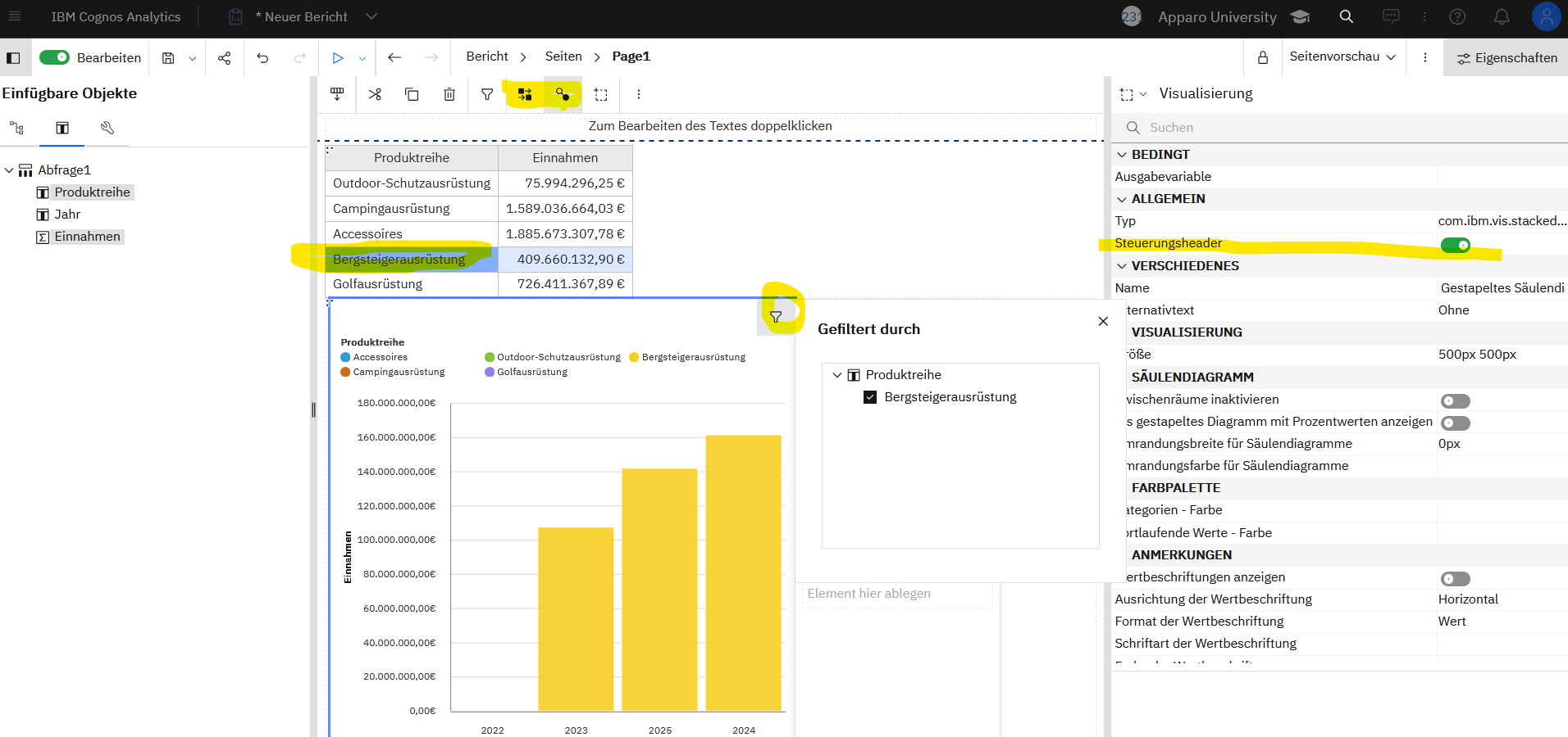 Zwischengedanke: Das Konzept der Active Reports sind zurück 🙂 Leider funktioniert das Filtern aktuell nur bei den Visualisierungen. Bei Kreuztabellen und Listen gibt es aktuell nur “Hervorheben”